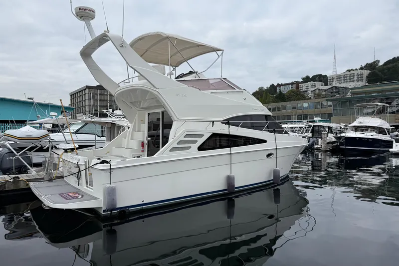 With abundant amenities and supreme appointments, the 35 Super Sport is proof positive that big surprises can indeed come in smaller packages. With generous exterior and interior spaces, the 35 provides an extraordinary escape from the ordinary express-cruiser experience. The true departure begins on the roomy command bridge. Its comfortable lounge with seating for four, stationed just forward of the helm, invites passengers to sit back and enjoy the ultimate vantage point. An integrated staircase leads to an expansive cockpit and a fun-lover's swim platform where activities are only limited by the imagination. Step inside the full-beam salon to find ultimate space made for living. Updated decor includes designer fabrics and beautiful cherry wood cabinetry providing ample storage. Sure to be a favorite relaxation spot, the sofa offers double recliners, as well as a sleeper option or additional storage beneath. Rounding out the comfort features is an entertainment group with 20" flat-screen TV and DVD player. No need to fantasize about having a fully-appointed galley. This one comes complete - Ceran glass-top electric range, built-in microwave/convection oven, upright refrigerator/freezer, coffeemaker, and gorgeous yet practical, Corian solid-surface countertops. And at every turn, every inch of space is cleverly maximized to provide an extraordinary amount of welcome storage. The face-to-face dinette with bench seats does double duty, providing the perfect mealtime setting while also converting to a double berth for overnight guests or family. When you're ready for that dreamlike state, an ideal master stateroom awaits. Behind the solid cherry wood door lies a queen island berth with innerspring mattress, perfect for an afternoon snooze or all-night slumber. The head, with companionway access, includes a fully enclosed shower stall with integral bench seat and a stylish vanity.