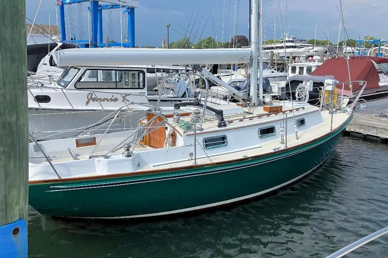 Hull was constructed of all hand-layed solid fiberglass. Balsa-cored deck was molded in one piece. Forest green Awlgripped hull (2022) and off white Awlgripped decks (2021), bronze opening ports (with screens) and bronze deck hardware. Full keel with attached rudder and cutaway forefoot. Aperture-protected propeller. Varnished exterior teak trim. In 2022 the bridgedeck between the cockpit and companionway entrance was professionally altered to include a step for easier cabin access.