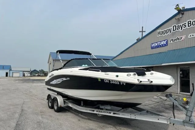 Enjoy the drive and ride of a V-Hull and beach party capacity of a Deck Style boat with the 223 DC. Convenience and comfort features include a Panoramic wrap around walk thru windshield, Portside mid ship enclosed Dressing Room, and "leather touch upholstery". Some of the construction and design features include 11 drink holders, 7 storage compartments and 100% wood free construction. You will show up to the beach party in comfort and style in the 223 DC.