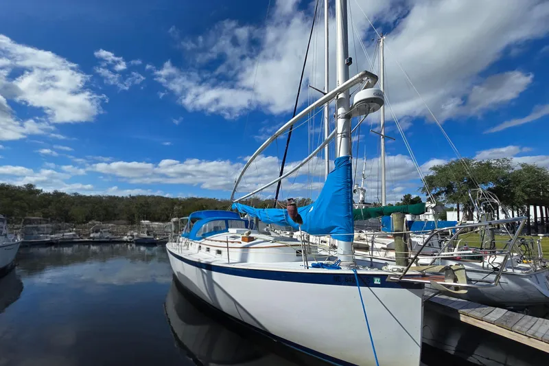 New fiberglass swim platform with S/S ladder (2021), full bimini with dodger (New 2021), davit system with a small crane to hoist the outboard, (2) two-speed winches (halliard/sheet), 1 single-speed winch, 35 lb. Bruce anchor w/ 20' chain, 250' rope. Extra Danforth anchor.