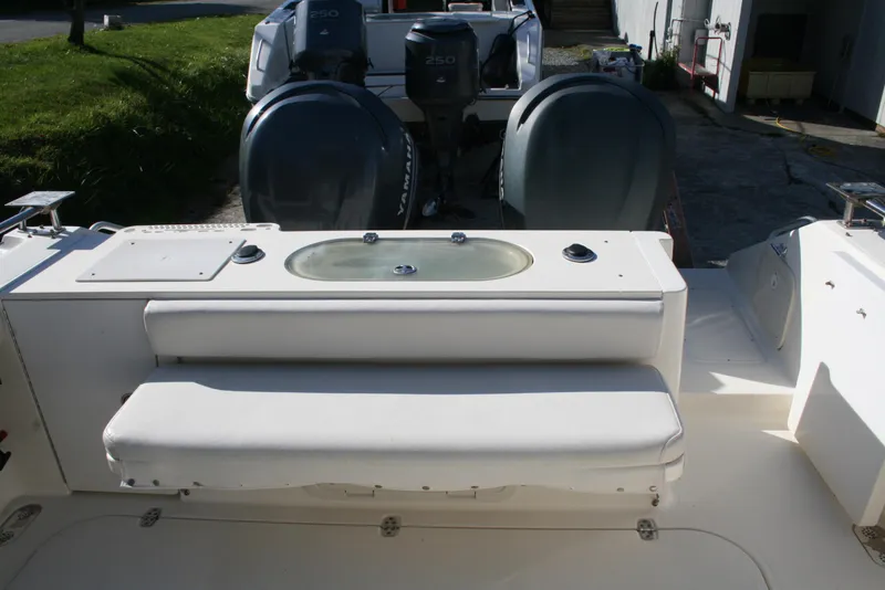 The cabin features a space-saving convertible L-lounge/settee on the starboard side with an opening just aft for access to the mid-cabin. The Mid-cabin is complete with overhead lighting. The galley utilizes a one-burner stove, microwave, refrigerator, ample storage, and a sink with hot/cold water and Corian countertop. The standup head comes complete with a handheld shower and Vacuflush system. The bridge deck features a tilt-away helm with horizontal instrumentation and a large area for flush mounting electronics. the captain drives from a mechanically actuated, oversized helm chair with an adjustable footrest below, which can swivel 360 degrees and move fore and aft. An L-lounge complements the port side with a sink. The standard hardtop comes complete with overhead storage, functional handrails and six rod-holders. Four rod holders come standard in the gunnels. The transom showcases a Corian cutting board with tool/rig cutouts and a 45-gallon circulating livewell complete with lid, ocean blue tub and vertical flow distribution. The fish box is insulted, gasketed and removable for access below. the aft drawer system also removes for access to the aft bilge and important mechanical systems. The ride, performance and styling are sure to make this boat a prize among boaters and fishermen looking to move into a bigger express style machine.