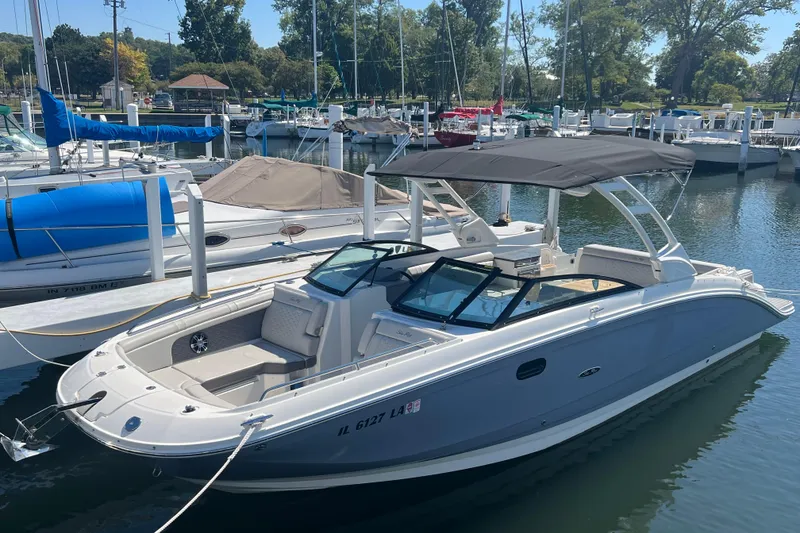 Hull Side Color - Horizon, Hull Side Colored Hull, Hull Bottom - White, Black Canvas - Optional, Flooring Color - Grey, Cockpit Color - Stone, Premier Stereo Upgrade (Spkr/Subwoofer/Amp), Head - Interior Upgrade, Teak Cockpit Table, Windlass - Rope / Chain w/Galvanized Anchor, Digital Dash w/Merc Vslview Link(SGL9"), Blue LED Lighting Package, Seadek on Swim Platform, Submersible Swim Platform - Manual, Cockpit Cover w/ Tonneau Cover, Flooring, Cockpit - Infinity Woven Vinyl, Transom Sunpad (Replaces AFT Facing Seats), White Watersports Tower w/Bimini, Bow Table W/Dedicated Storage