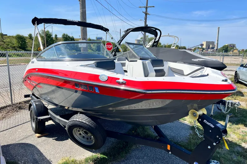 Hull Color - Red/Grey/White, Shore Land'r Custom Trailer, Yamaha / Supercharged 1.8/ w/ 51 hrs, Snap On Cover (installed at the dealer), Bimini Top (open top does not connect to windshield), Winter Storage Cover (covers entire boat on land), Spare Tire, Swivel Buckets, Stereo, Touch Screen.